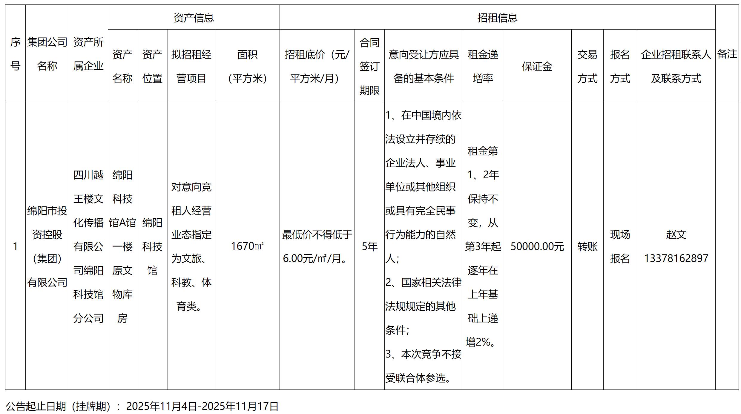 四川越王楼文化传播有限公司绵阳科技馆分公司资产出租公告