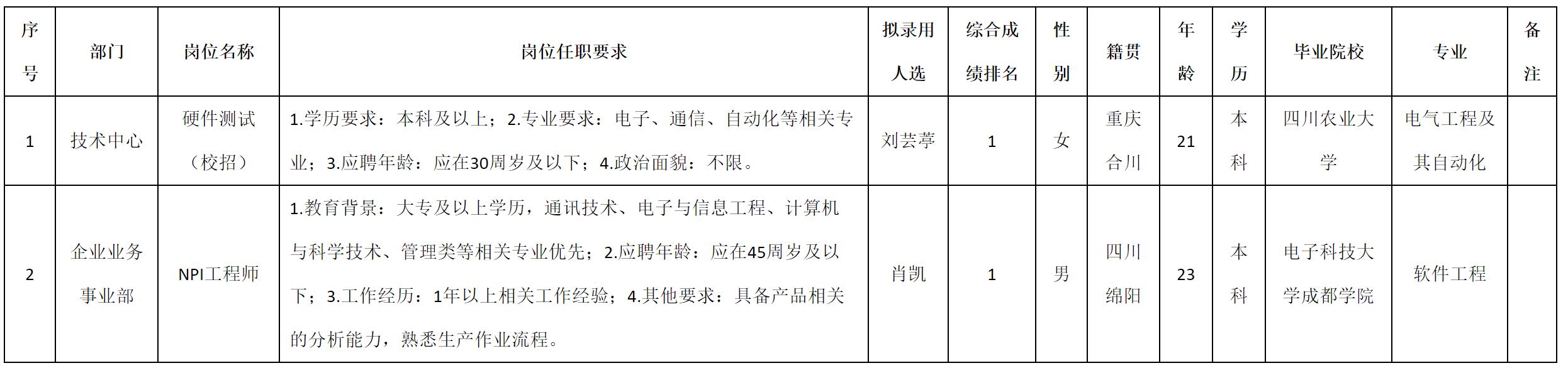 根据四川九州电子科技股份有限公司发布的招聘公告及招聘相关规定,经测试、考察、体检等程序,拟录用刘芸葶等2名同志到四川九州电子科技股份有限公司工作,现予以公示,具体情况如下: