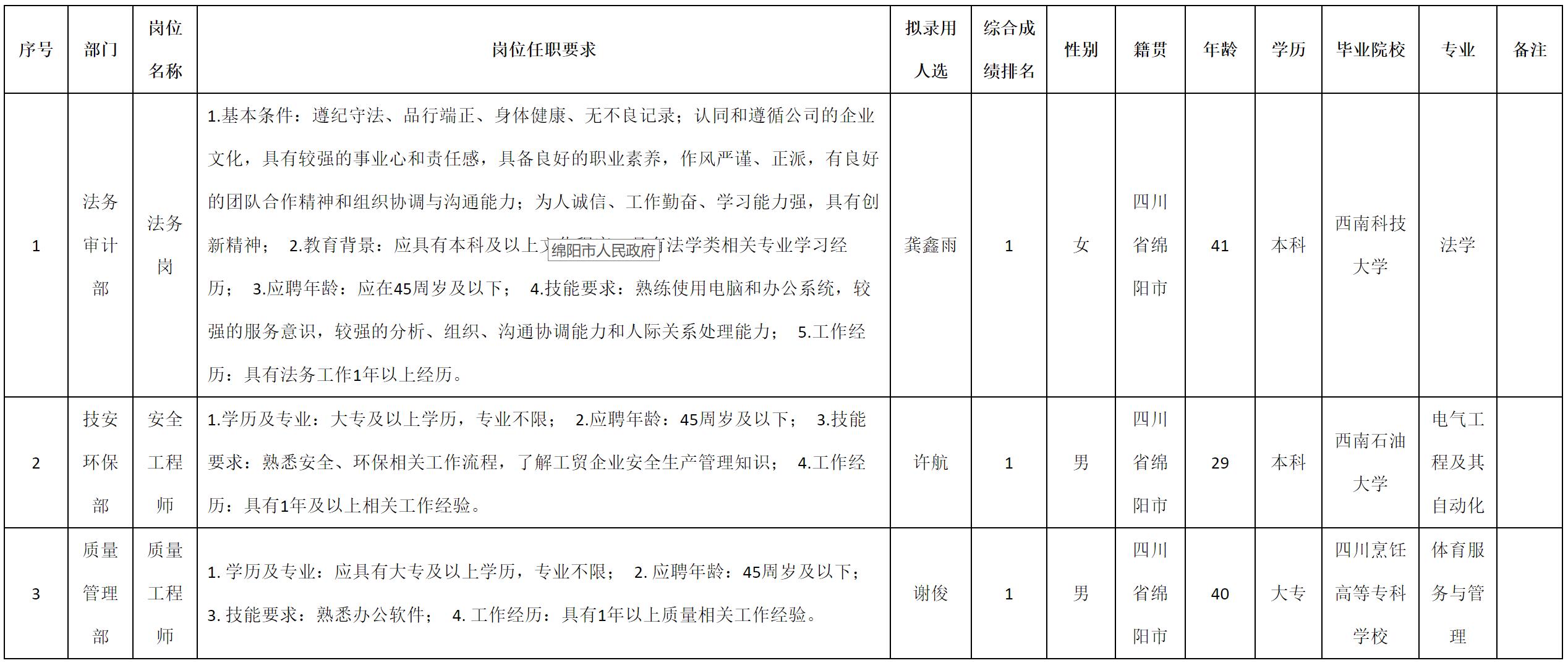 根据四川九州光电子技术有限公司发布的招聘公告及招聘相关规定,经测试、考察、体检等程序,拟录用龚鑫雨等3名同志到四川九州光电子技术有限公司工作,现予以公示,具体情况如下: