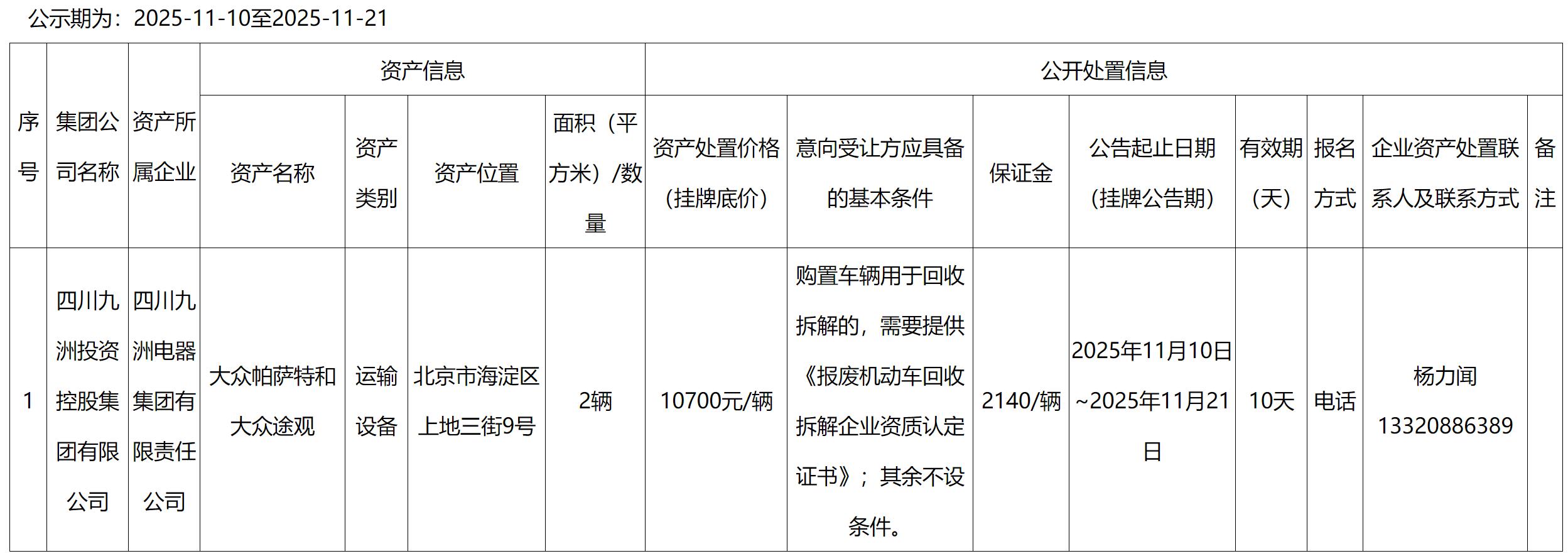 四川九洲电器集团有限责任公司资产处置公告