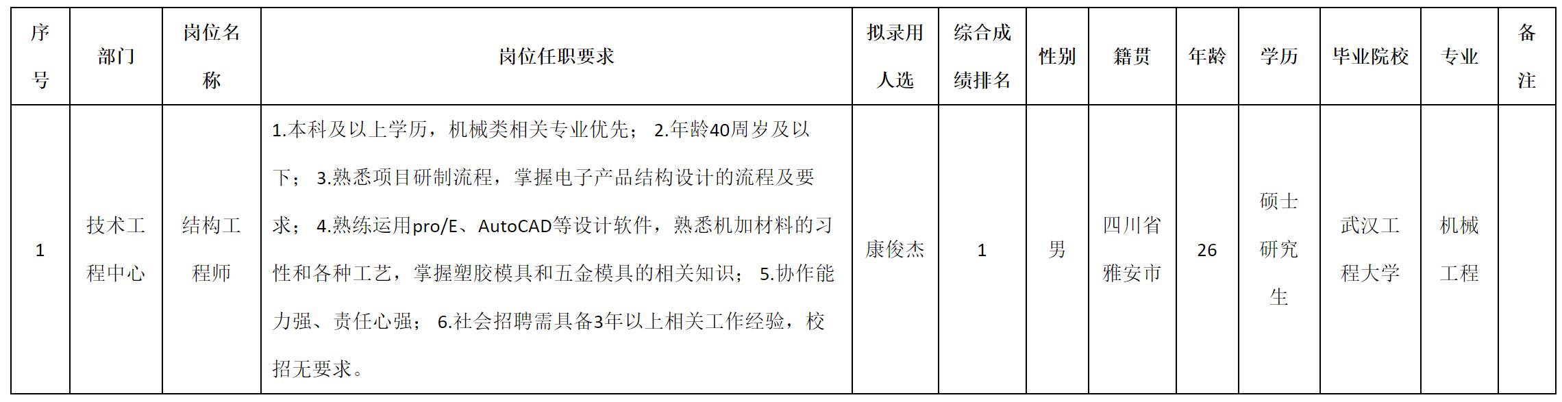 根据四川九洲光电科技股份有限公司发布的招聘公告及招聘相关规定,经测试、考察、体检等程序,拟录用康俊杰同志到四川九洲光电科技股份有限公司工作,现予以公示,具体情况如下: