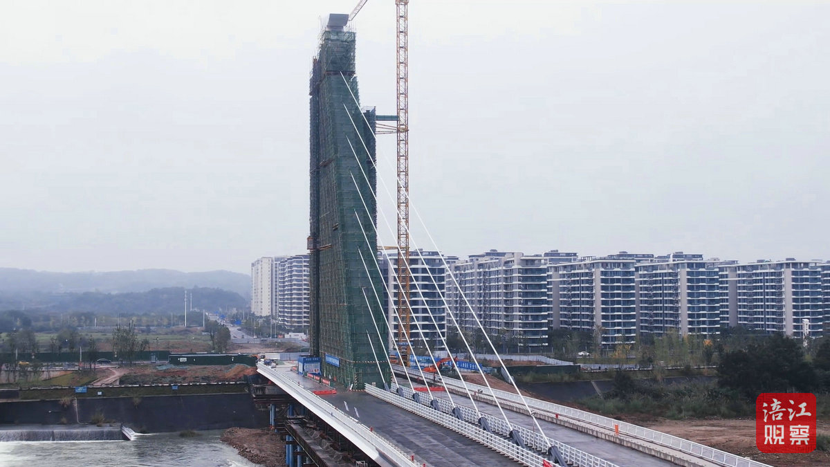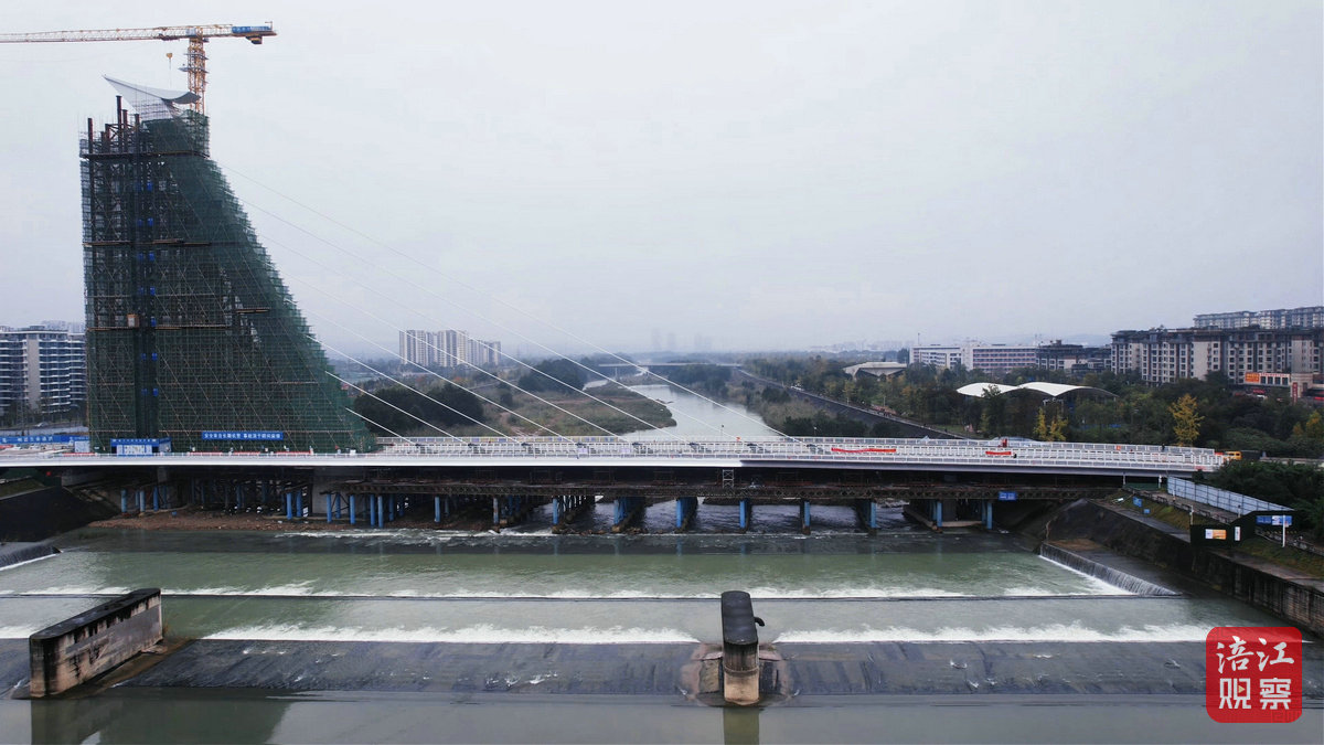 11月11日,记者在现场看到,十多名工人正在进行桥面铺装、引桥段施工等收尾工作。调元大桥横跨安昌河,全长约267米,桥宽29米,是连接河西片区与河东新区的重要通道。大桥采用独塔单索面无背索斜拉桥设计,桥塔高耸如鹤颈,拉索如翼,勾勒出“云鹤飞扬”的灵动画卷。