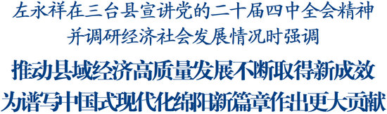 学习好贯彻好党的二十届四中全会精神是当前和今后一个时期的重大政治任务。调研中,左永祥深入基层一线向干部群众宣讲全会精神。他说,党的二十届四中全会是在我们党团结带领全党全国各族人民以中国式现代化全面推进强国建设、民族复兴伟业的关键时期召开的一次十分重要的会议,意义重大、影响深远。各地各部门要精心组织传达学习,广泛开展宣传宣讲,做到学思践悟、知行合一。要对标对表全会部署要求,科学谋划好“十五五”时期经济社会发展工作,切实把全会精神转化为实实在在的成效。期间,左永祥听取了三台县经济社会发展情况汇报,对各项工作取得的成绩给予肯定。他指出,三台县是全省丘区农业大县、百万人口大县,历史文化悠久、产业基础良好,要立足资源禀赋,强化系统思维,坚持因地制宜,扎实推进以县城为重要载体的新型城镇化建设,统筹抓好乡村全面振兴,科学布局建设一批优质均衡的公共服务设施,努力走出县域经济高质量发展新路径。要巩固农业基础优势,加快农业全产业链培育发展,高标准建设现代农业园区,大力发展现代种业,做大做强农业品牌,积极培育乡村新产业新业态,推动农业“接二连三”融合发展。要提升工业发展质效,加快“智改数转”步伐,发挥龙头企业链主作用,深入开展产业招商、以商招商,精准引进上下游企业,推动特色优势产业建圈强链,筑牢县域经济坚实支撑。要做优文旅消费,依托独特文旅资源,发挥体育赛事活动带动作用,创新思路推进文商体旅深度融合发展,增加优质供给,激发消费活力,不断满足人民日益增长的美好生活需要。当前,要统筹做好抓项目、扩投资、促消费、惠民生、保安全等重点工作,全力冲刺四季度,坚决完成全年目标任务,确保“十四五”圆满收官、“十五五”良好开局。
