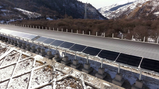 首先是供能,施工人员在久马高速公路试验段的护栏处,架设1.2米高、3.2毫米厚的碲化镉薄膜玻璃,这种玻璃适用于高寒环境且不自燃,弱光条件下也可发电;