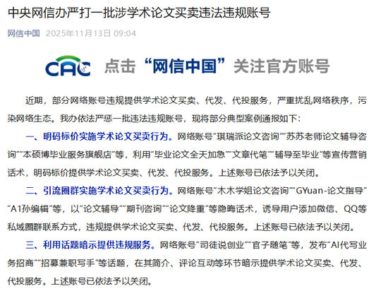 三、利用话题暗示提供违规服务。网络账号“司徒说创业”“官子随笔”等,发布“AI代写业务招商”“招募兼职写手”等话题,在其简介、评论互动等环节暗示提供学术论文买卖、代发、代投服务。上述账号已依法予以关闭。