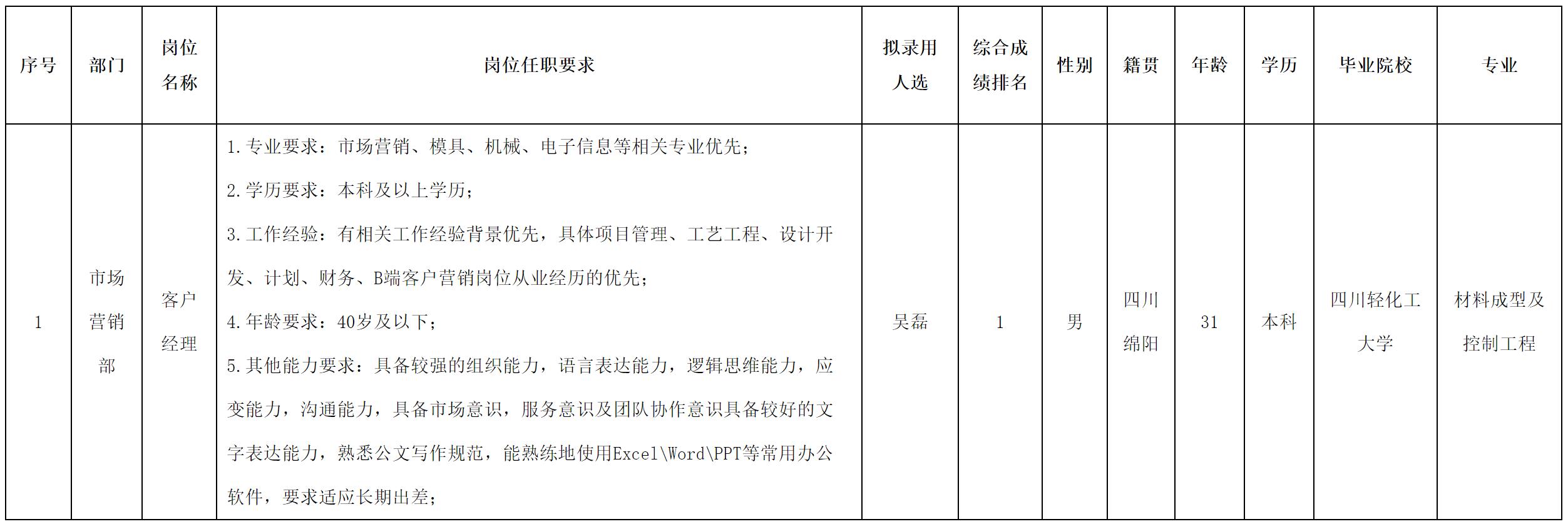 根据四川爱创科技有限公司发布的招聘公告及招聘相关规定,经面试、考察、体检等程序,拟录用吴磊同志到市场营销部工作,现予以公示,具体情况如下: