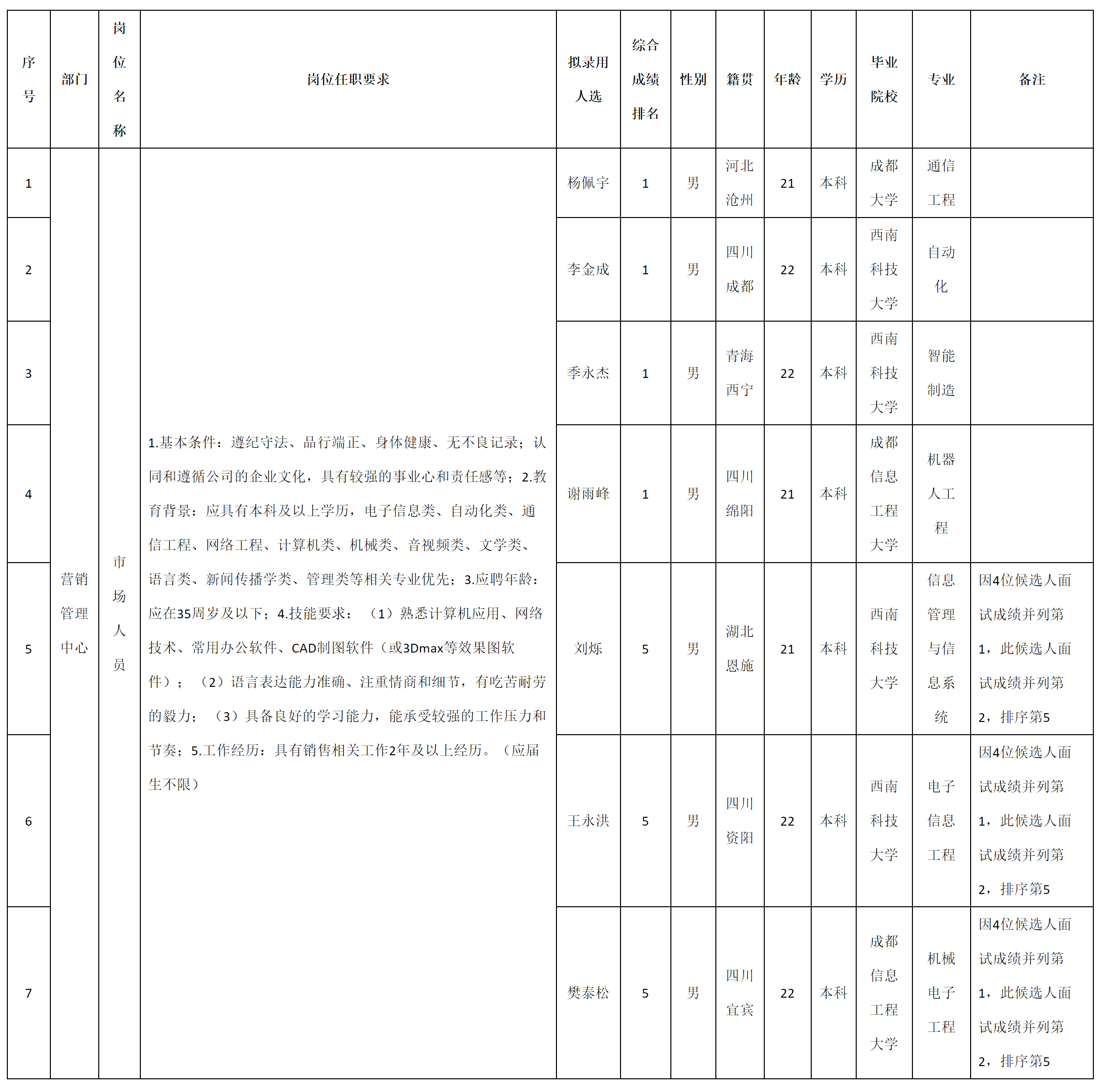 根据四川湖山电器股份有限公司发布的招聘公告及招聘相关规定,经测试、考察、体检等程序,拟录用杨佩宇等7名同志到四川湖山电器股份有限公司工作,现予以公示,具体情况如下: