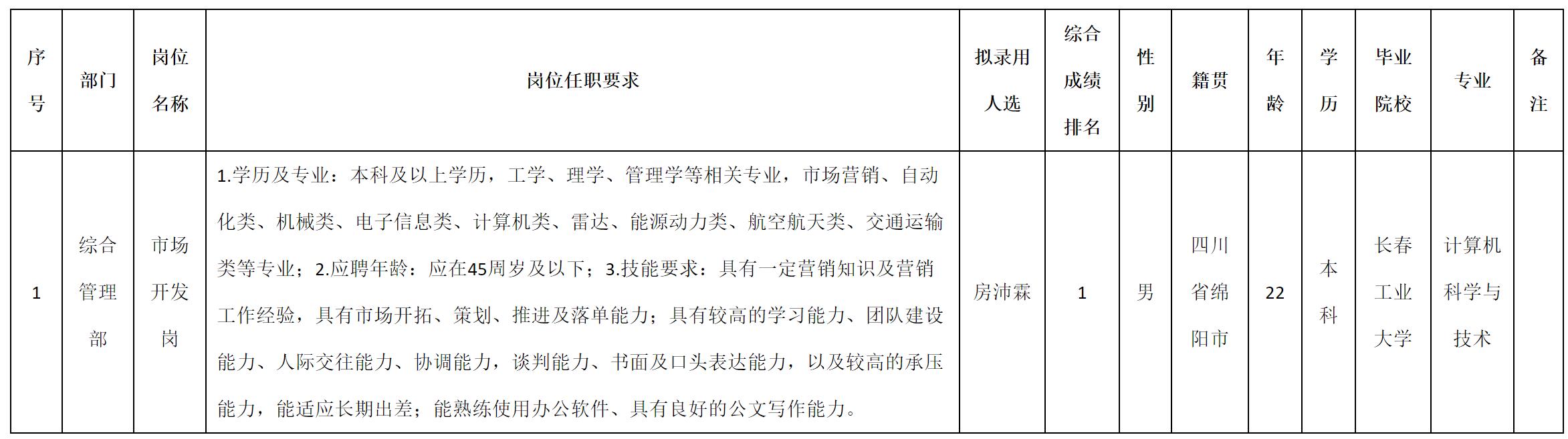 根据四川九洲永昌检测技术服务有限责任公司发布的招聘公告及招聘相关规定,经测试、考察、体检等程序,拟录用房沛霖同志到四川九洲永昌检测技术服务有限责任公司工作,现予以公示,具体情况如下: