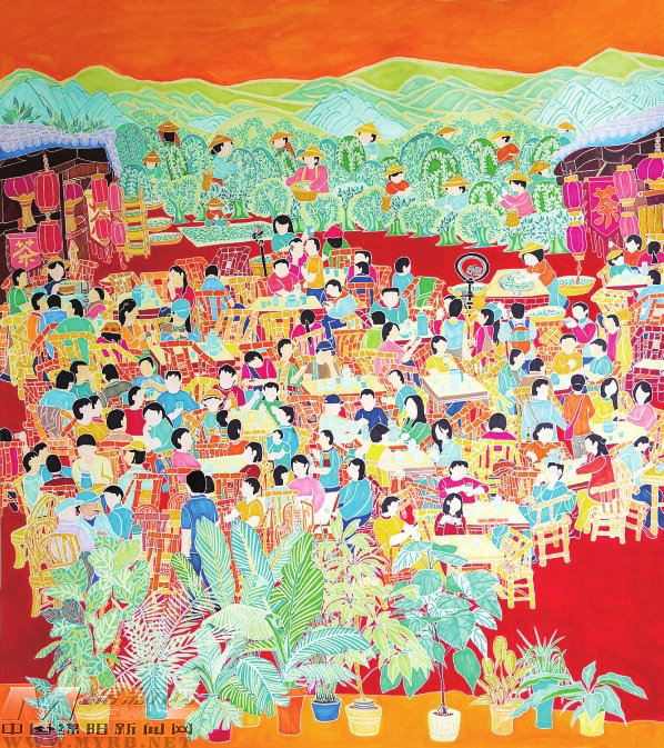 杨若雪的《茶香传薪新·享茶品丰饶》,以几何化梯田、圆桌茶宴构建画面秩序感,夸张变形的人物轮廓与茶树形态释放出情感张力,形成“拙中藏巧”的视觉语言。作品前半部分,茶农古法采茶、晒青、炒制的场景,与网络直播卖茶的光影交织,传统技艺与数字浪潮在茶香中完成对话;后半部分,游客围坐茶宴,笑语随茶汤漾开,品茗被升华为一场乡村美学仪式。作品以“薪火”延续文化基因,以“丰饶”描绘产业图景,在乡土烟火中熔铸时代精神,观者既能看见茶山律动,亦能品读乡村振兴的壮阔史诗。