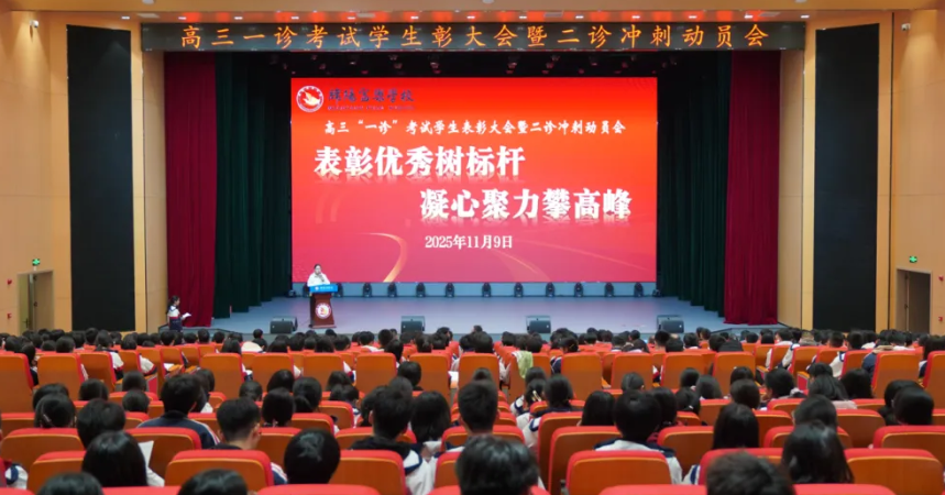 绵阳新闻网讯 为了表彰先进树立典范,激扬斗志砥砺前行,11月9日,绵阳富乐学校高中部在演艺中心多功能厅举行了以“表彰优秀树标杆·凝心聚力攀高峰”为主题的2025年秋高2023级一诊表彰大会暨二诊冲刺动员会。高中部行政、全体高三班主任与高三学子齐聚会场,共赴这场荣誉与奋进的青春之约。