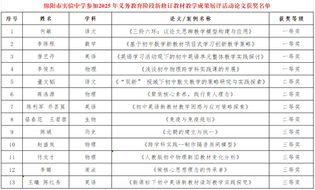 绵阳新闻网讯 11月7日,由绵阳市教育科学研究所精心组织的2025年义务教育阶段新修订教材教学成果展评活动成果揭晓。经过评委专家组公开、公平、公正的严格评审,绵阳市实验中学(绵阳七中)多名教师凭借扎实的专业功底与创新的教学实践,斩获多项大奖,成果丰硕。