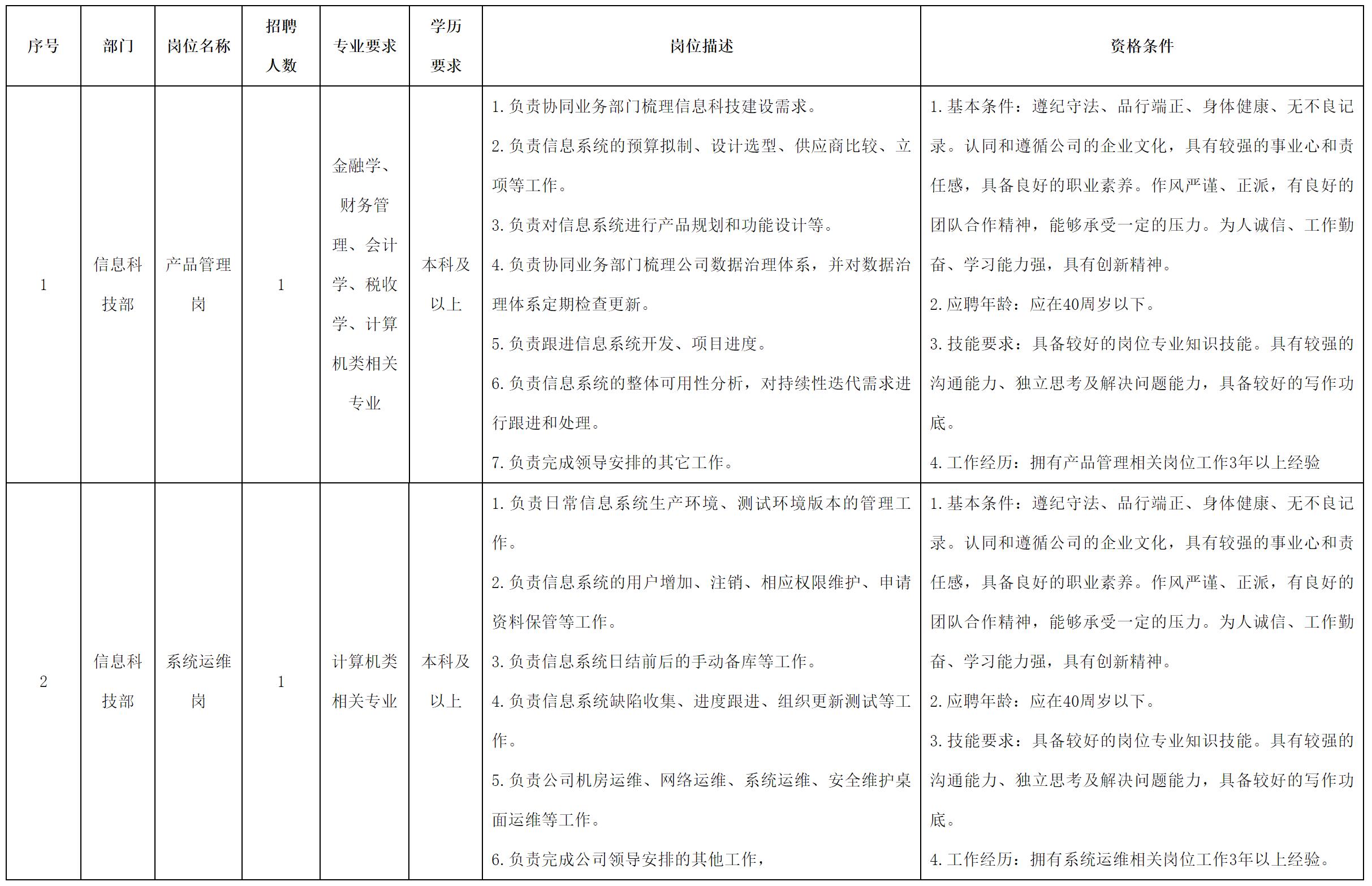 现因经营发展需要,公开招聘产品管理岗、系统运维岗各1名: