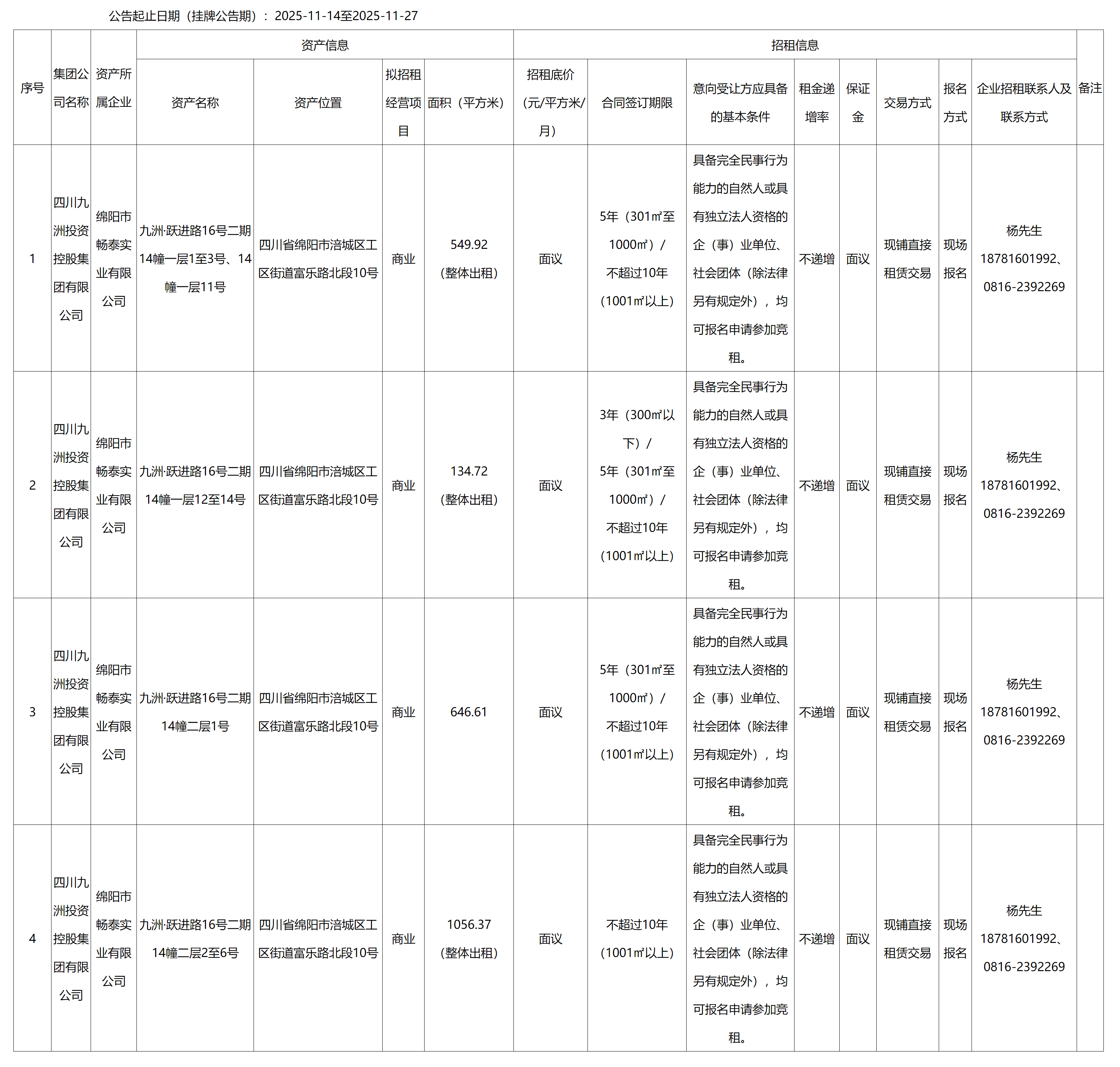 四川九洲千城商业管理有限公司九洲跃进路16号二期14幢楼商铺出租公告