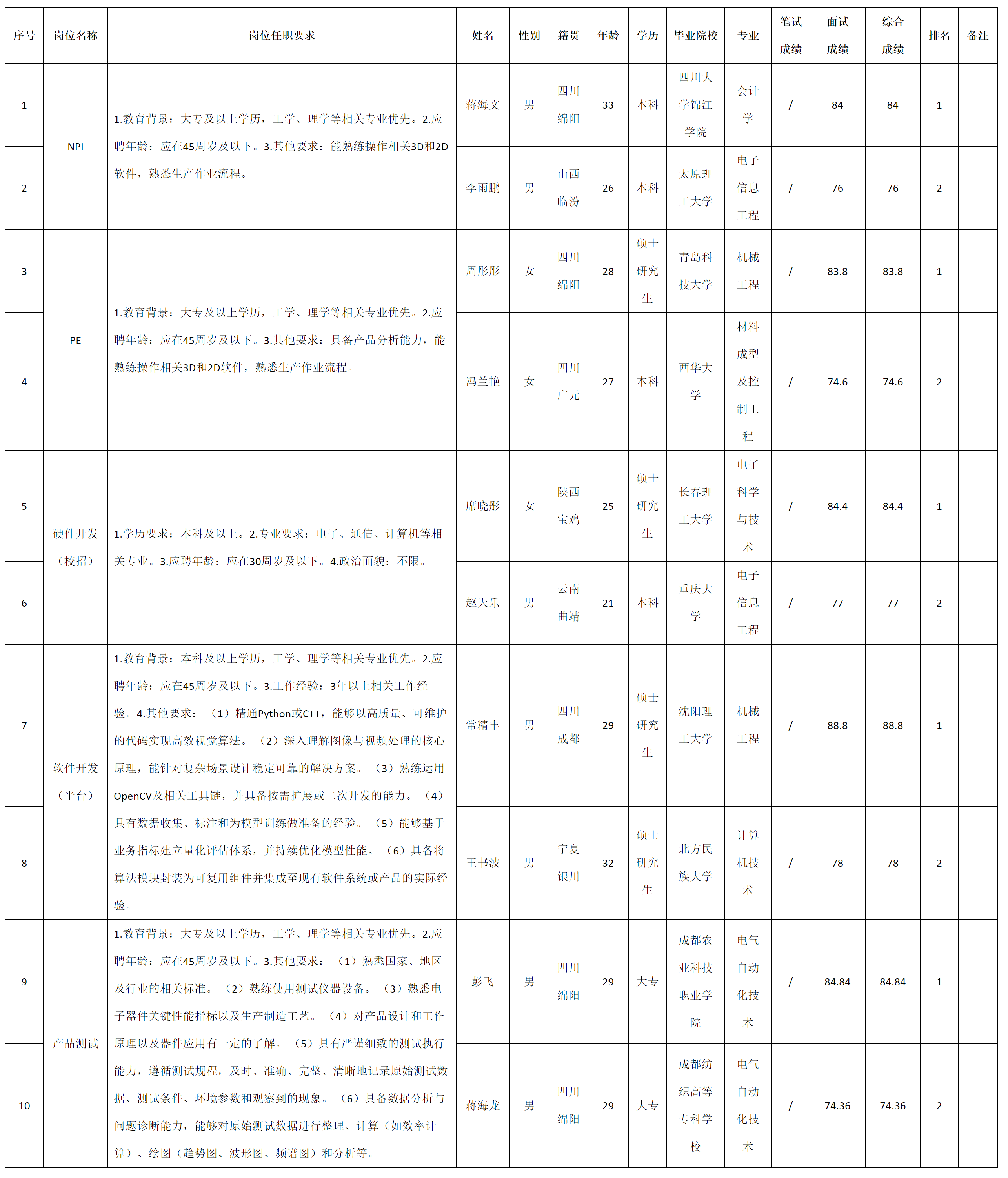 根据四川九州电子科技股份有限公司发布的招聘公告及招聘相关规定,现将测试成绩予以公示。