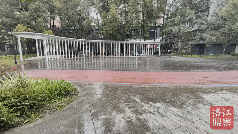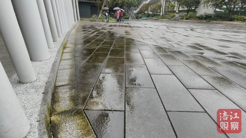 针对现存问题,他解释道:“天桥雨水落至绿地后,因高差将泥土溅到地面,导致泥垢堆积;地砖选用的是符合国标的陶瓷透水砖,第一年使用并无异常,目前是因灰尘堵塞砖缝,导致积水无法渗漏,这在透水材料中属常见现象;此外,现在还存在三处积水点,主要因为改造时施工方未在场地留有足够的坡度,场地过于平整,导致雨水无法排入绿化区。”