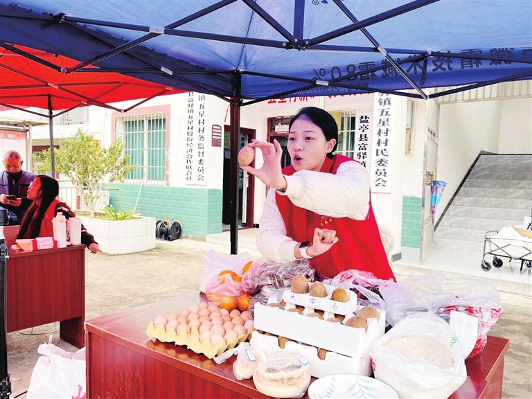 绵阳新闻网讯 “大家看,这些土鸡都是在山林里散养的,肉质紧实鲜美!”11月18日一早,在盐亭县富驿镇五星村村委会门口,参加“直播带货·助农增收”志愿服务活动的志愿者陈静文化身网络主播,对着镜头热情洋溢地介绍着当地的特色农产品。直播间里,在线人数持续攀升,订单纷至沓来,其中农家土鸡更是成为爆款单品,带动整体销售额节节走高。