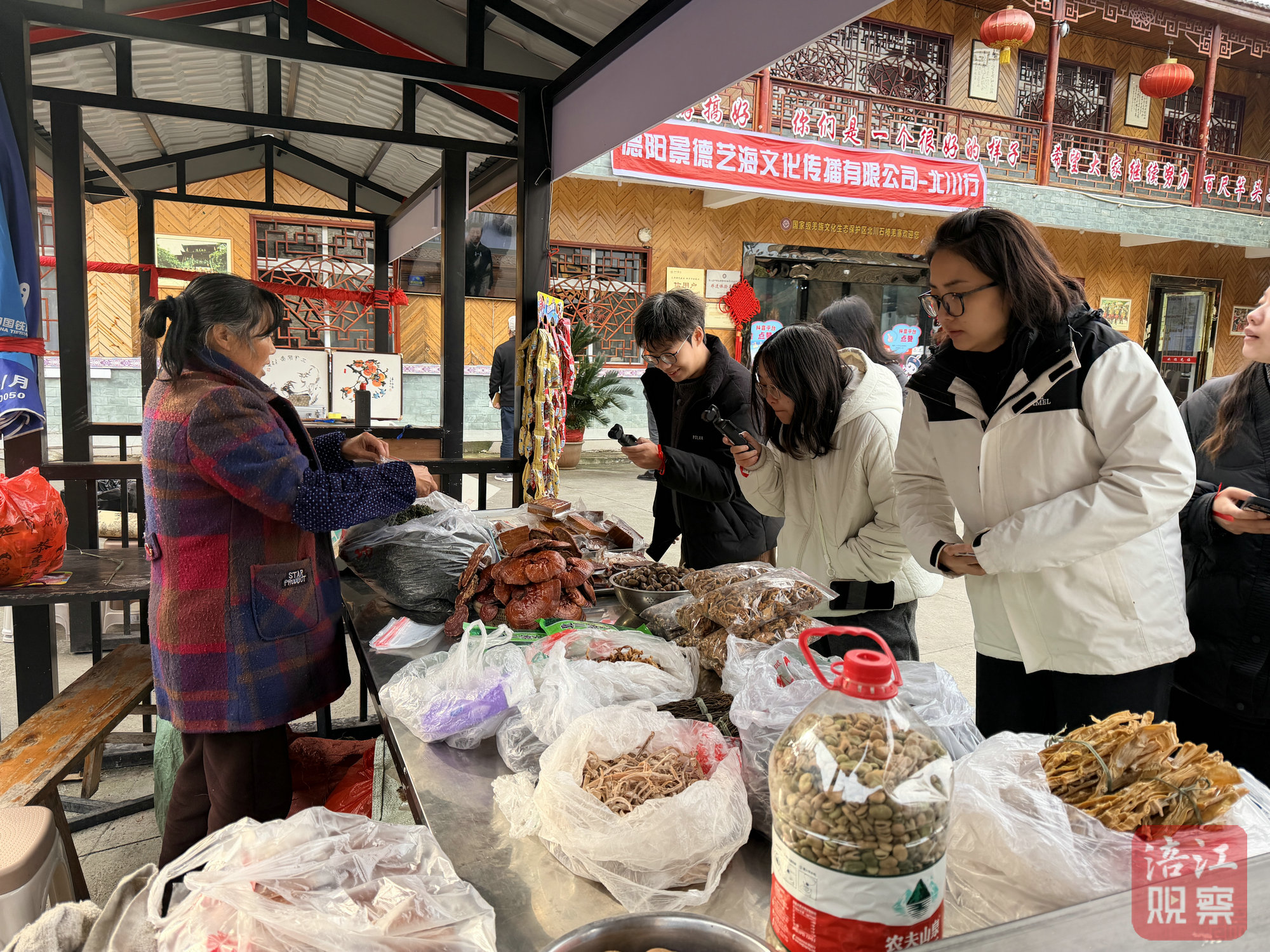 来到石椅村羌寨广场,大家看到,村民们正拿着自家熏制的北川老腊肉、刚采摘的野生猕猴桃热情招呼游客品尝。