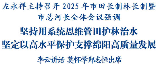 绵阳新闻网讯 11月20日,2025年市田长制林长制暨市总河长全体会议召开,省委常委、市委书记左永祥主持会议并讲话。他强调,要深入学习贯彻习近平生态文明思想和习近平总书记对四川工作系列重要指示精神,全面落实党中央、国务院和省委、省政府决策部署,坚持用系统思维管田、护林、治水,推动田长制、林长制、河湖长制走深走实,坚定以高水平保护支撑绵阳高质量发展。