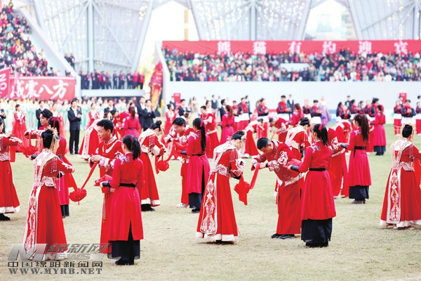 比赛中场,在《绵阳之恋》的优美旋律中,50对新人举行了集体婚礼。 记者 陈冬冬 摄