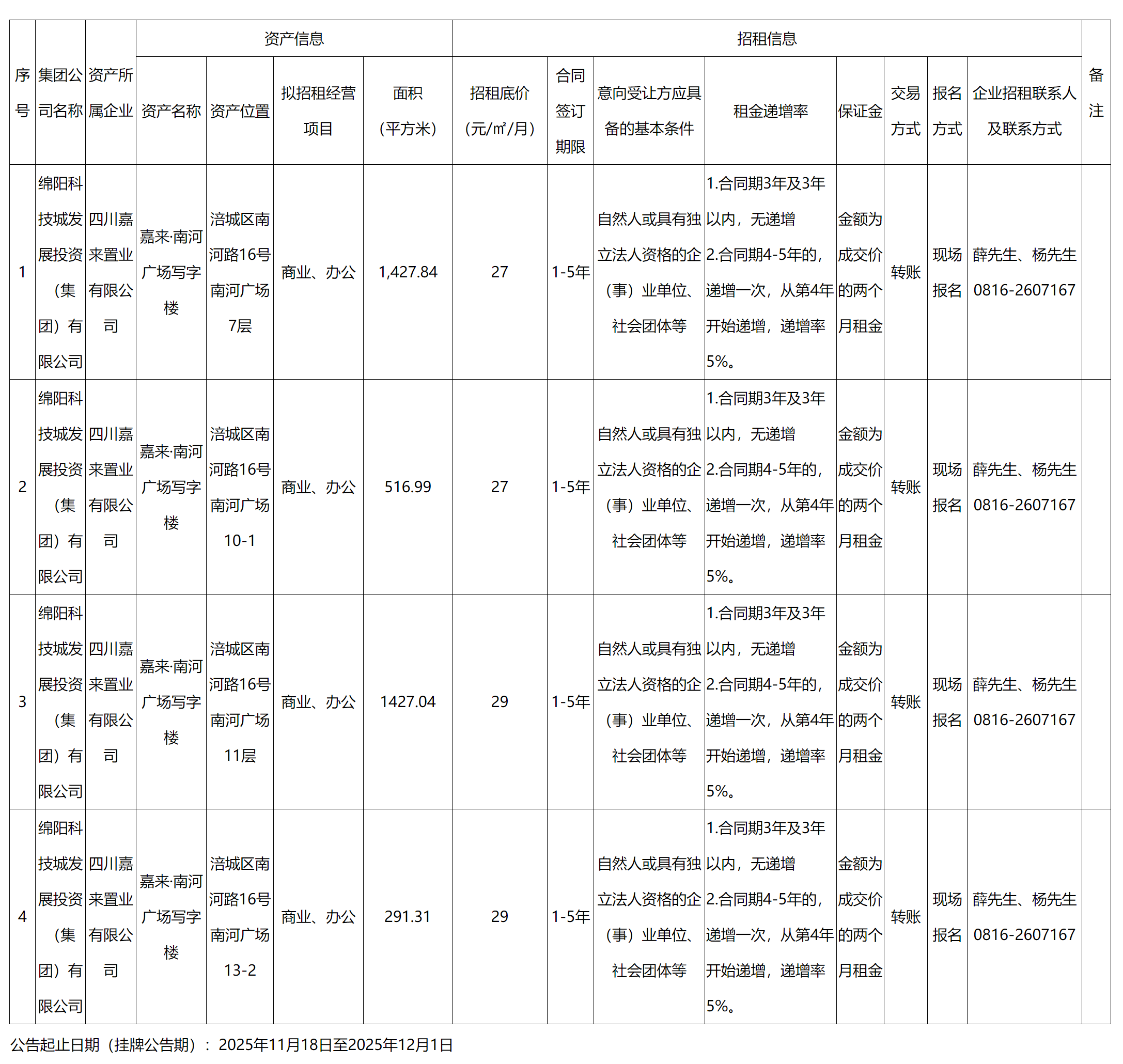 四川嘉来置业有限公司资产出租公告