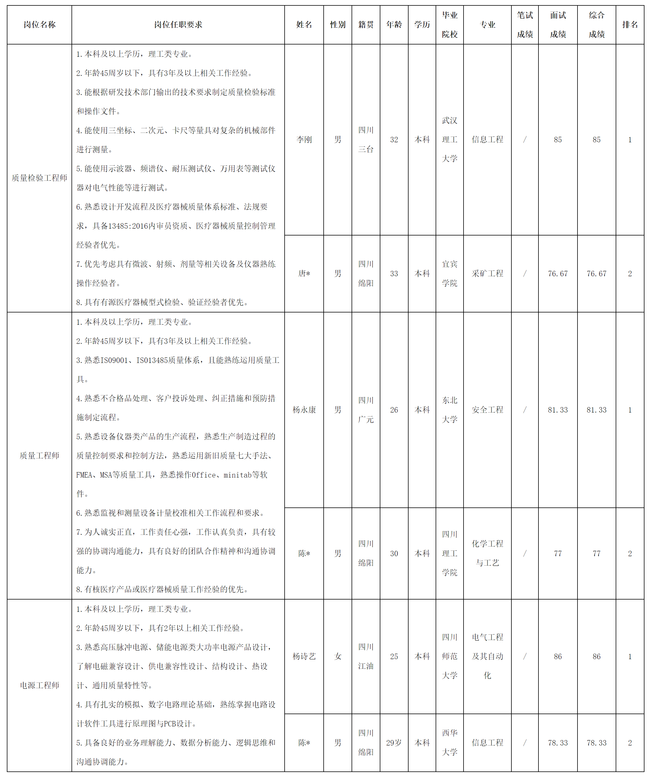 根据中玖闪光医疗科技有限公司发布的招聘公告及招聘相关规定,现将测试成绩予以公示。