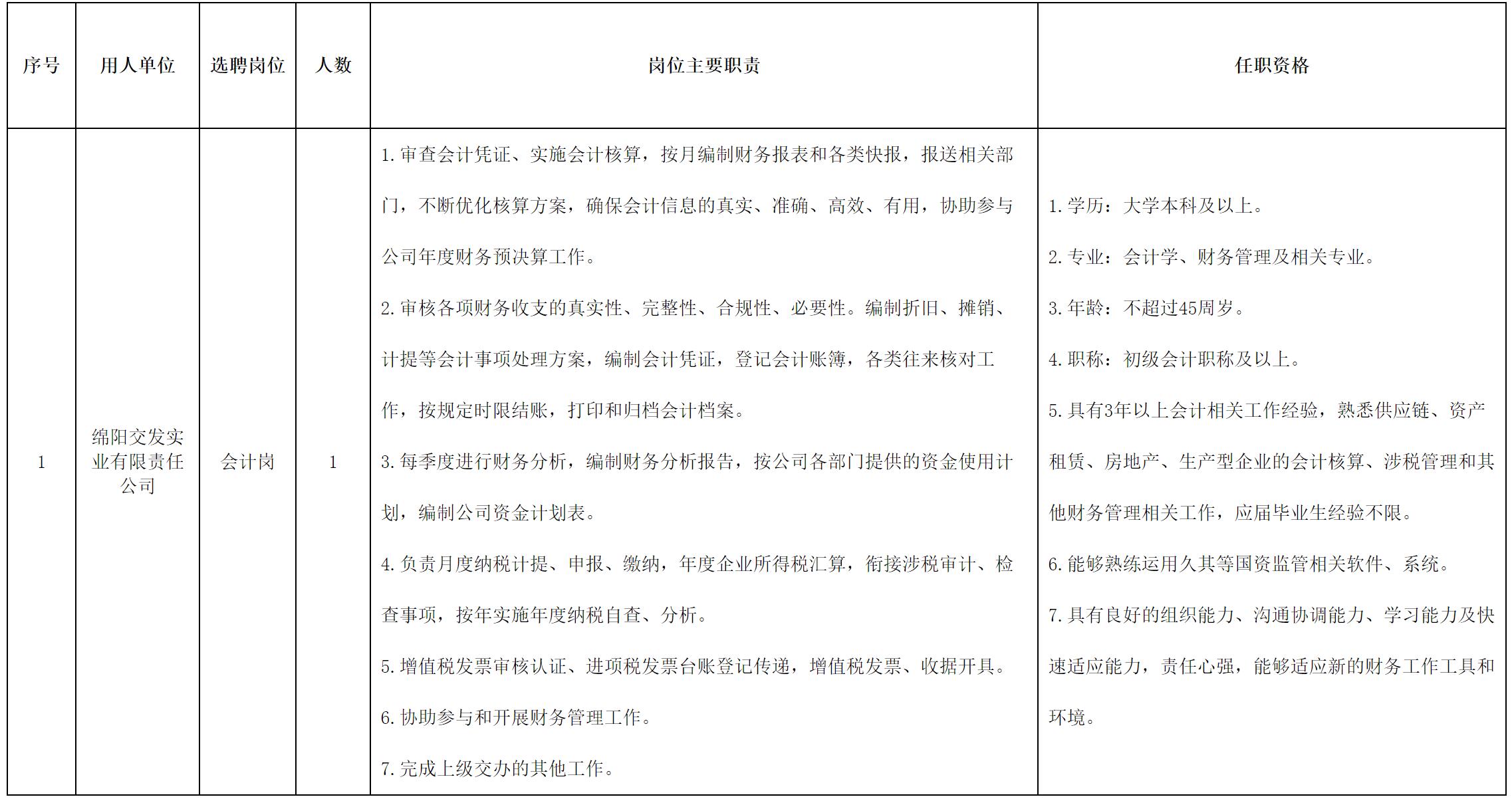 招聘信息将在绵阳市国资委、绵阳交通发展集团有限责任公司官网、绵阳交发实业有限责任公司官网发布。