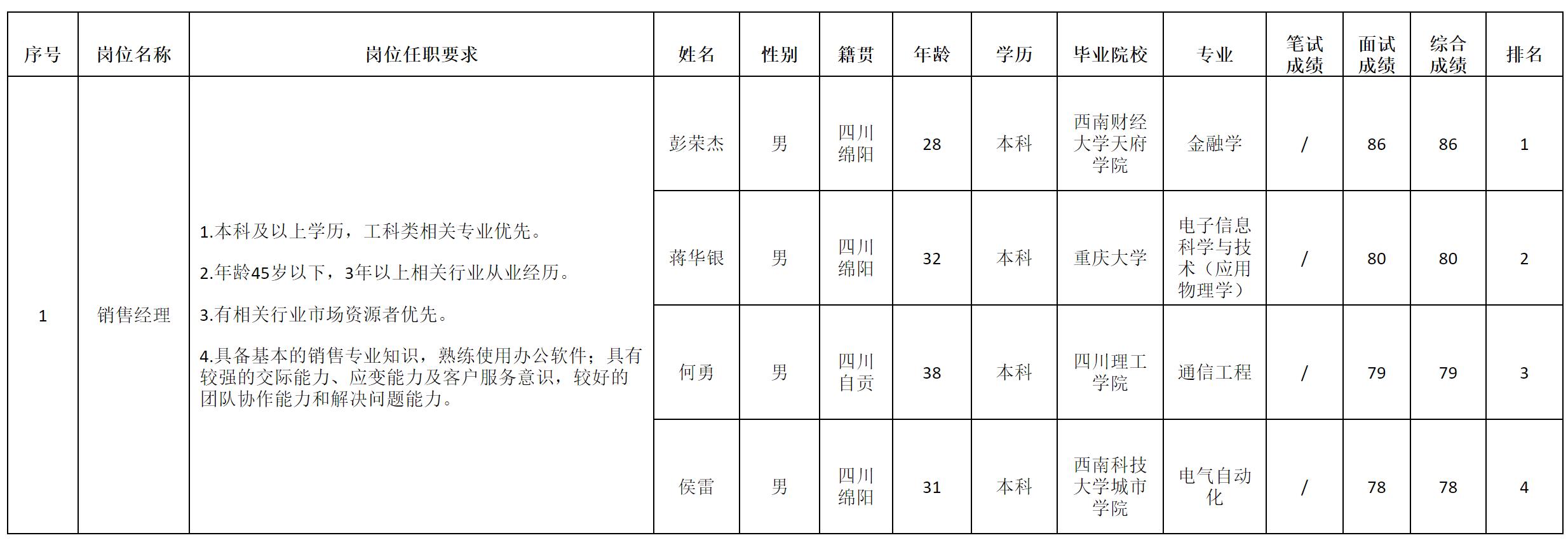 根据四川长虹电子科技有限公司发布的招聘公告及招聘相关规定,经面试等程序,现将面试成绩予以公示。