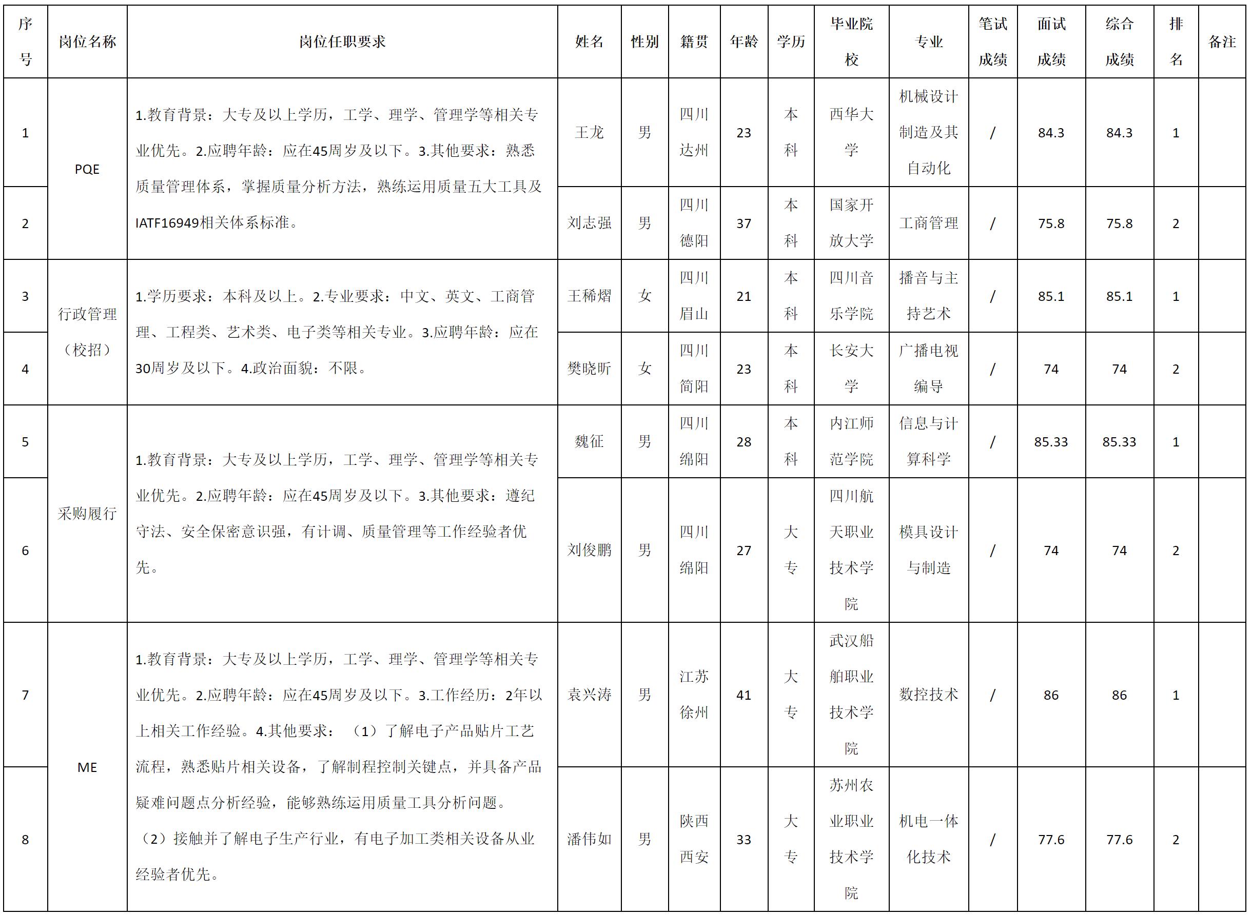 根据四川九州电子科技股份有限公司发布的招聘公告及招聘相关规定,现将测试成绩予以公示。