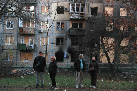 11月14日,在乌克兰首都基辅市第聂伯区,当地居民站在遭受空袭损毁的房屋前。新华社记者李东旭摄