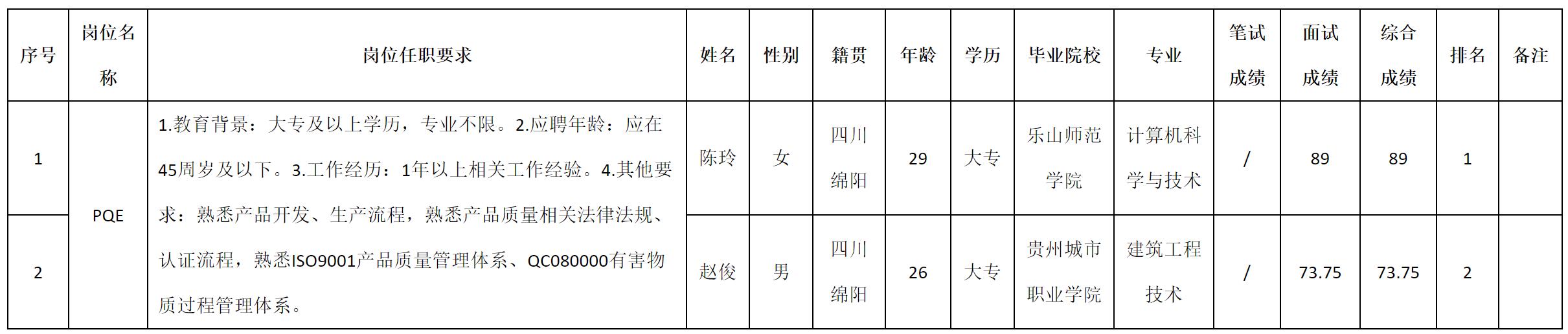 根据四川九州电子科技股份有限公司发布的招聘公告及招聘相关规定,现将测试成绩予以公示。