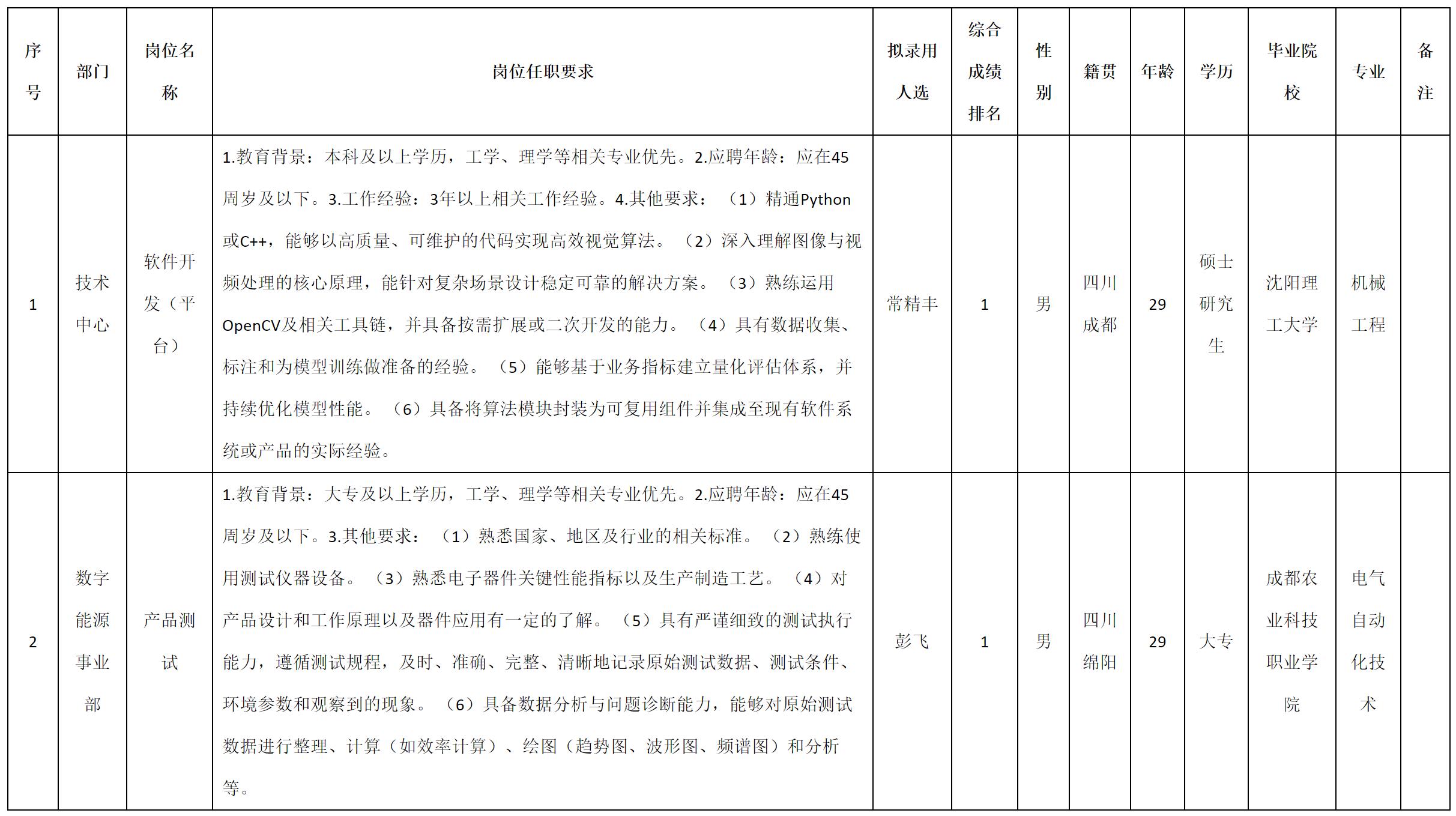 根据四川九州电子科技股份有限公司发布的招聘公告及招聘相关规定,经测试、考察、体检等程序,拟录用常精丰等2名同志到四川九州电子科技股份有限公司工作,现予以公示,具体情况如下: