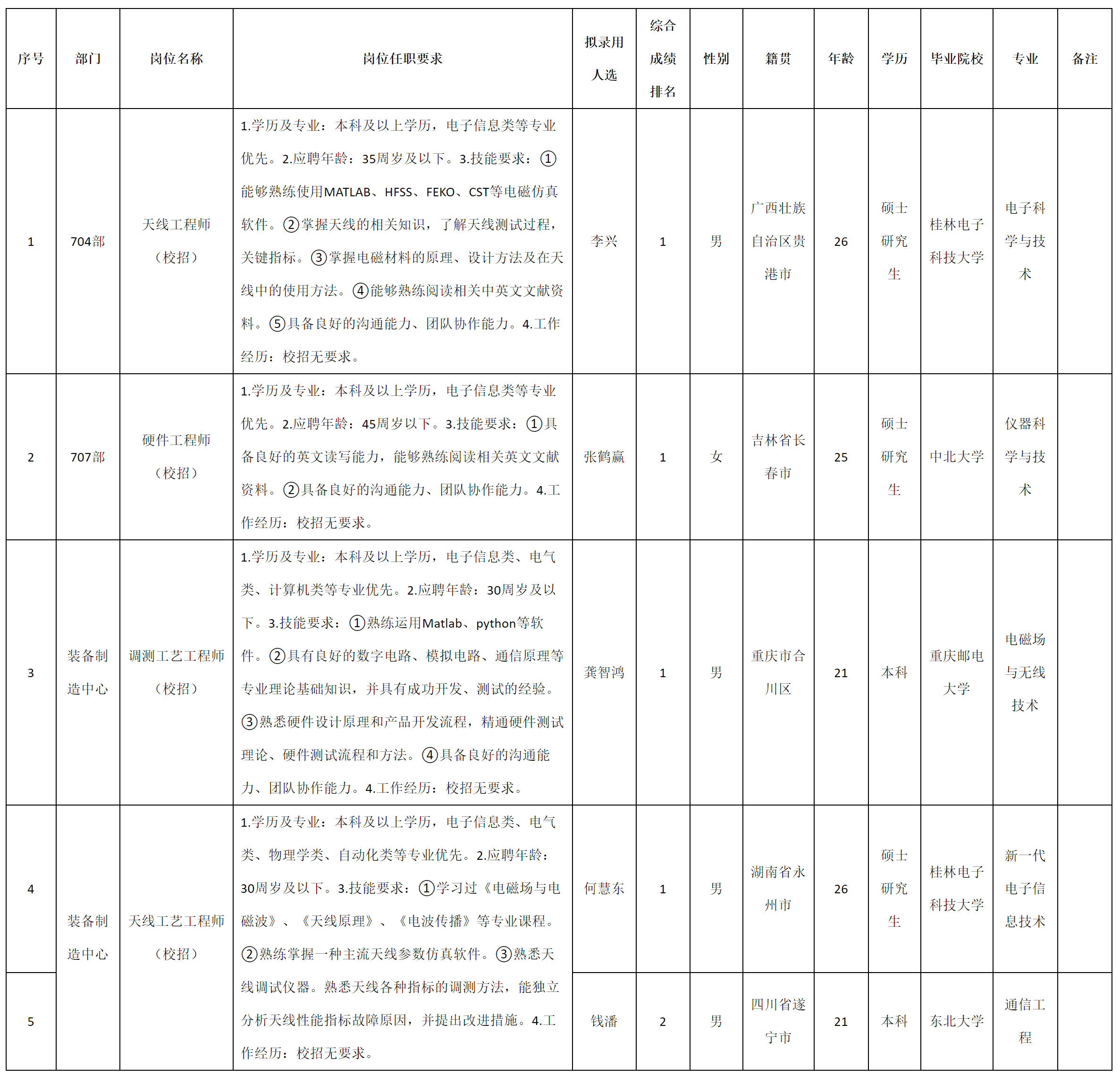 根据四川九洲电器集团有限责任公司发布的招聘公告及招聘相关规定,经测试、考察、体检等程序,拟录用李兴等5名同志到四川九洲电器集团有限责任公司工作,现予以公示,具体情况如下: