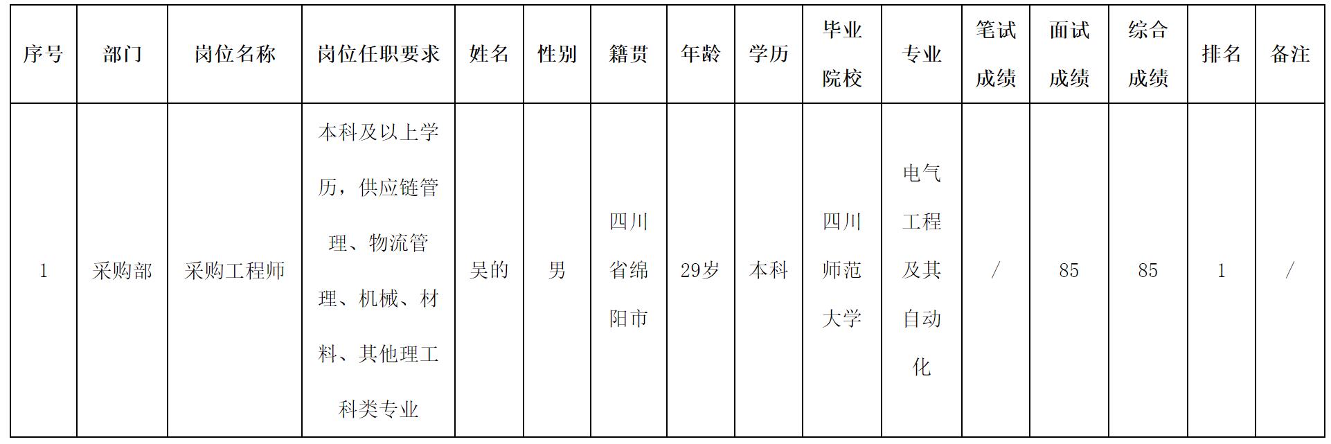 根据四川波鸿实业有限公司发布的招聘公告及招聘相关规定,经面试等程序,现将面试成绩予以公示。