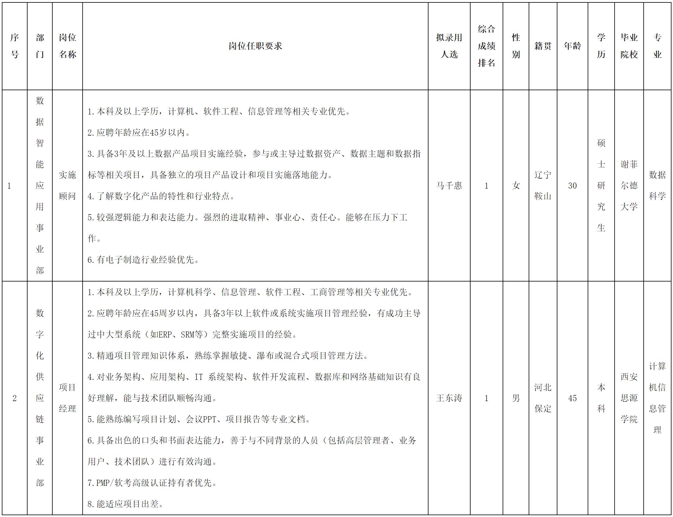 根据四川虹信软件股份有限公司发布的招聘公告及招聘相关规定,经测试、考察、体检等程序,拟录用马千惠、王东涛同志到四川虹信软件股份有限公司工作,现予以公示,具体情况如下: