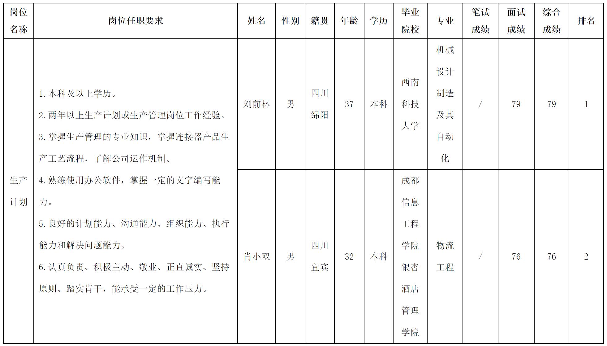 根据四川华丰科技股份有限公司发布的招聘公告及招聘相关规定,现将测试成绩予以公示。