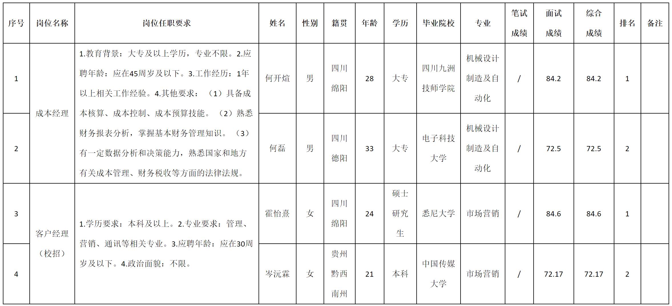 根据四川九州电子科技股份有限公司发布的招聘公告及招聘相关规定,现将测试成绩予以公示。