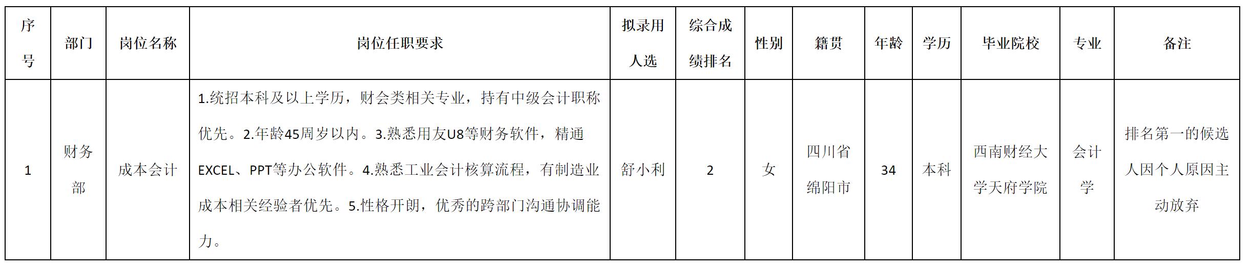 根据四川安和精密电子电器股份有限公司发布的招聘公告及招聘相关规定,经测试、考察、体检等程序,拟录用舒小利同志到四川安和精密电子电器股份有限公司工作,现予以公示,具体情况如下: