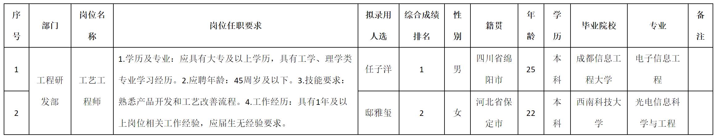 根据四川九华光子通信技术有限公司发布的招聘公告及招聘相关规定,经测试、考察、体检等程序,拟录用任子洋等2名同志到四川九华光子通信技术有限公司工作,现予以公示,具体情况如下: