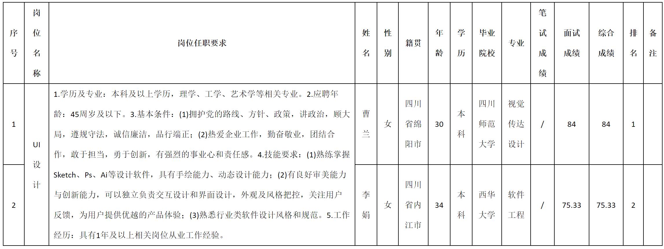 根据四川九强通信科技有限公司发布的招聘公告及招聘相关规定,现将测试成绩予以公示。