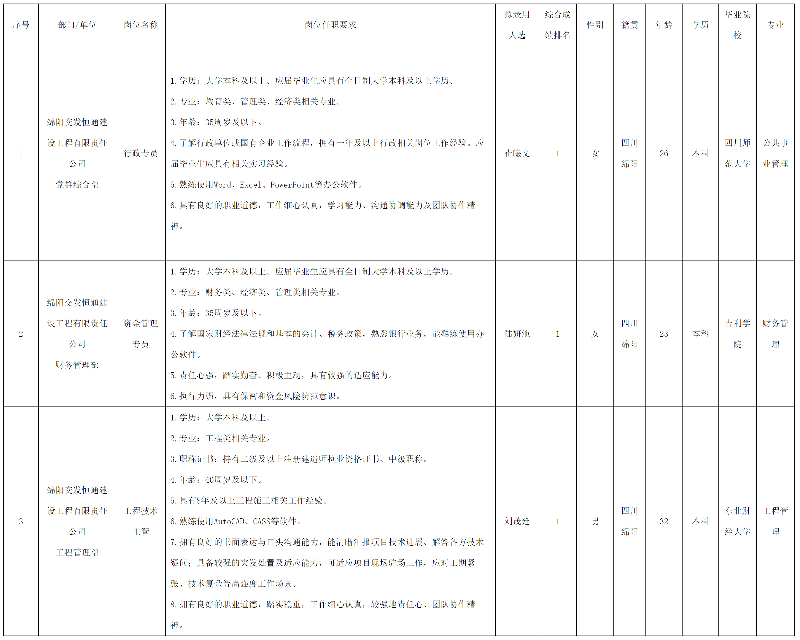 根据我司发布的招聘公告及招聘相关规定,经初试、复试、体检、背景调查等程序,拟录用崔曦文等3名同志到绵阳交发恒通建设工程有限责任公司工作,现予以公示,具体情况如下:
