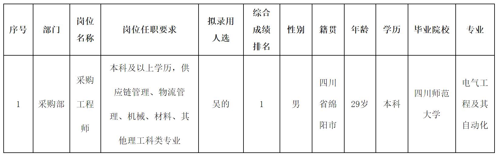 根据四川波鸿实业有限公司发布的招聘公告及招聘相关规定,经面试、体检等程序,拟录用吴的同志到四川威斯卡特工业有限公司绵阳分公司工作,现予以公示,具体情况如下: