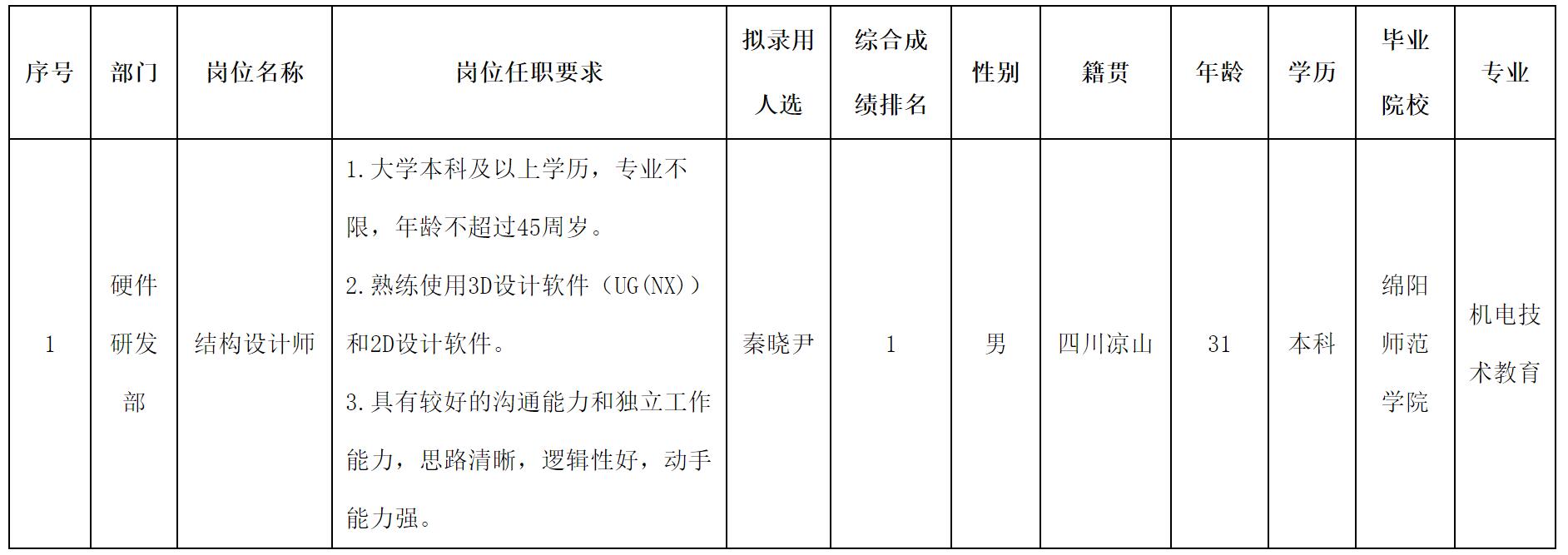 根据四川长虹新网科技有限责任公司发布的招聘公告及招聘相关规定,经面试、考察、体检等程序,拟录用秦晓尹同志到公司工作,现予以公示,具体情况如下: