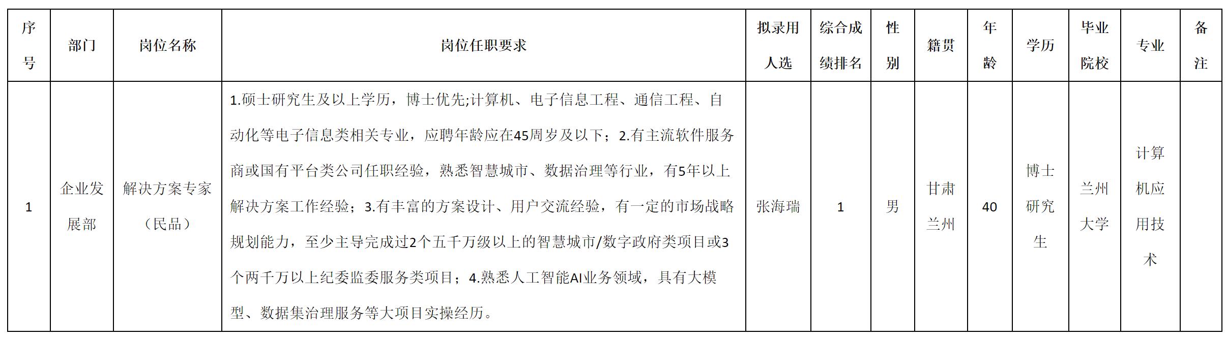 根据四川九洲投资控股集团有限公司软件与数据智能军团发布的招聘公告及招聘相关规定,经测试、考察、体检等程序,拟录用张海瑞同志到四川九洲投资控股集团有限公司软件与数据智能军团工作,现予以公示,具体情况如下: