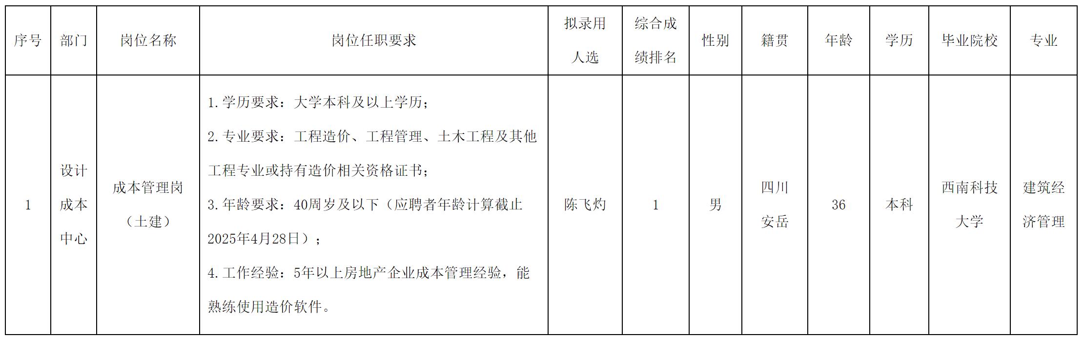 根据绵阳市绵投置地有限公司发布的招聘公告及招聘相关规定,经笔试、面试、考察、体检等程序,拟录用陈飞灼同志到绵阳市绵投置地有限公司工作,现予以公示,具体情况如下: