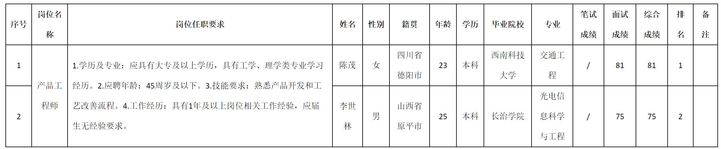 四川九华光子通信技术有限公司关于招聘产品工程师测试成绩的公示