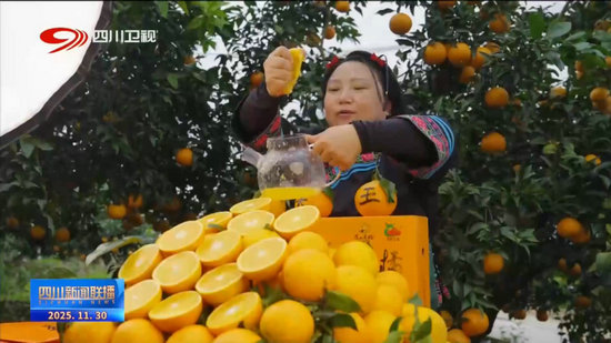 记者 施源:现在正值晚熟柑橘的丰收季,我现在是在眉山市青神县高台镇的百家池村。这里有一个晚熟柑橘基地,柑橘品种多达9种,而种植面积达3000多亩。