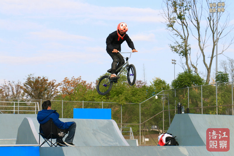现场不少身着专业护具的小轮车运动员正热火朝天地进行日常训练,随着车把灵活转动,队员们蹬车加速、顺势腾空,一连串转体、转把、空中摆尾的高难度动作一气呵成。