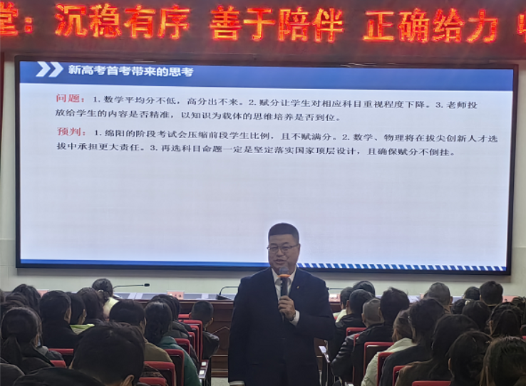 明晰方向,赋能备考之路。一诊鉴学明方向,蓄力前行向未来。 年级分管副校长江达昌发表讲话。他指出,要以长远眼光看待高考的意义,以发展视角看待绵阳一诊分数——此次考试是备考的“加油站”而非“终点站”,核心是明确后续努力方向。对成绩理想的孩子,要鼓励戒骄戒躁、补足细微不足;对成绩暂不理想的孩子,需多理解支持、帮助重拾信心。江达昌强调,现阶段发现问题远比高考时更幸运,呼吁家长与学校携手、信任老师,重点关注孩子的人际关系与心理健康。他最后希冀,家校同心聚力,必能为孩子保驾护航,助力其在青春赛道上跑出最好成绩。