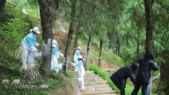 志愿者为古柏涂刷石灰。记者 刘晓东 摄