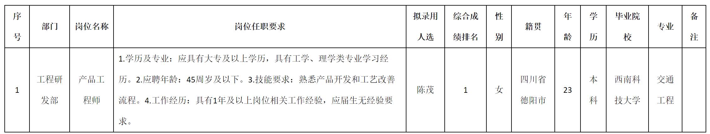 根据四川九华光子通信技术有限公司发布的招聘公告及招聘相关规定,经测试、考察、体检等程序,拟录用陈茂同志到四川九华光子通信技术有限公司工作,现予以公示,具体情况如下: